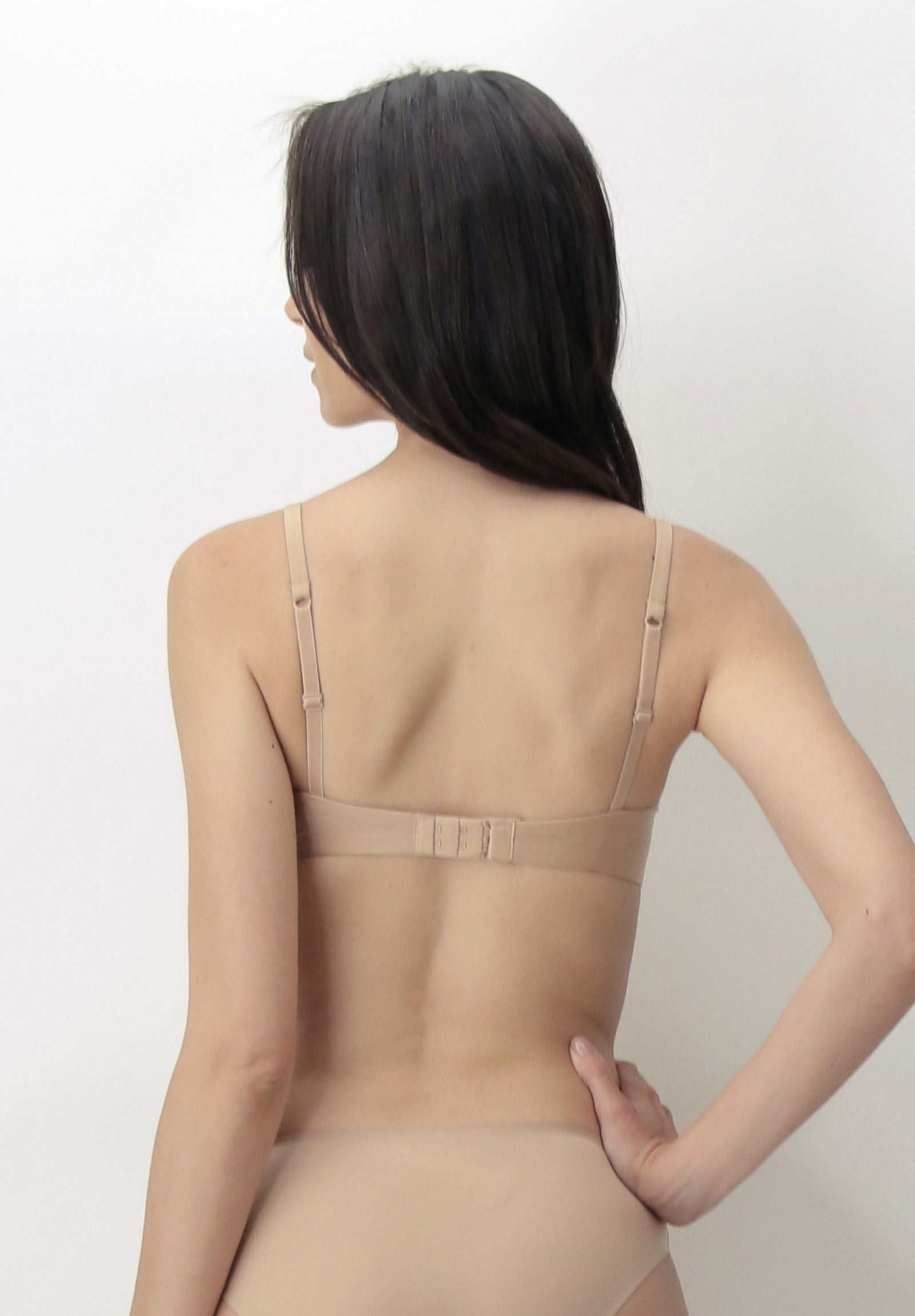 Balconcino imbottito senza ferretto realizzato con morbide coppe imbottite preformate. Uno speciale sostegno intorno alla coppa dona uno straordinario effetto balconcino pur senza il supporto del ferretto. La microfibra utilizzata, molto leggera, ha un effetto mano pesca, è morbidissima e leggermente brillante. I fusti del capo sono doppi le elasticature nascoste. Le spalline sono ricoperte in microfibra. Il gancio di chiusura dietro è a 4 posizioni. Balenette laterali. Questo reggiseno per tutte le caratteristiche descritte risulta invisibile sotto agli abiti ed eccezionalmente confortevole. E' pensato per le donne che non desiderano indossare capi con il ferretto ma che vogliono un décolleté importante.