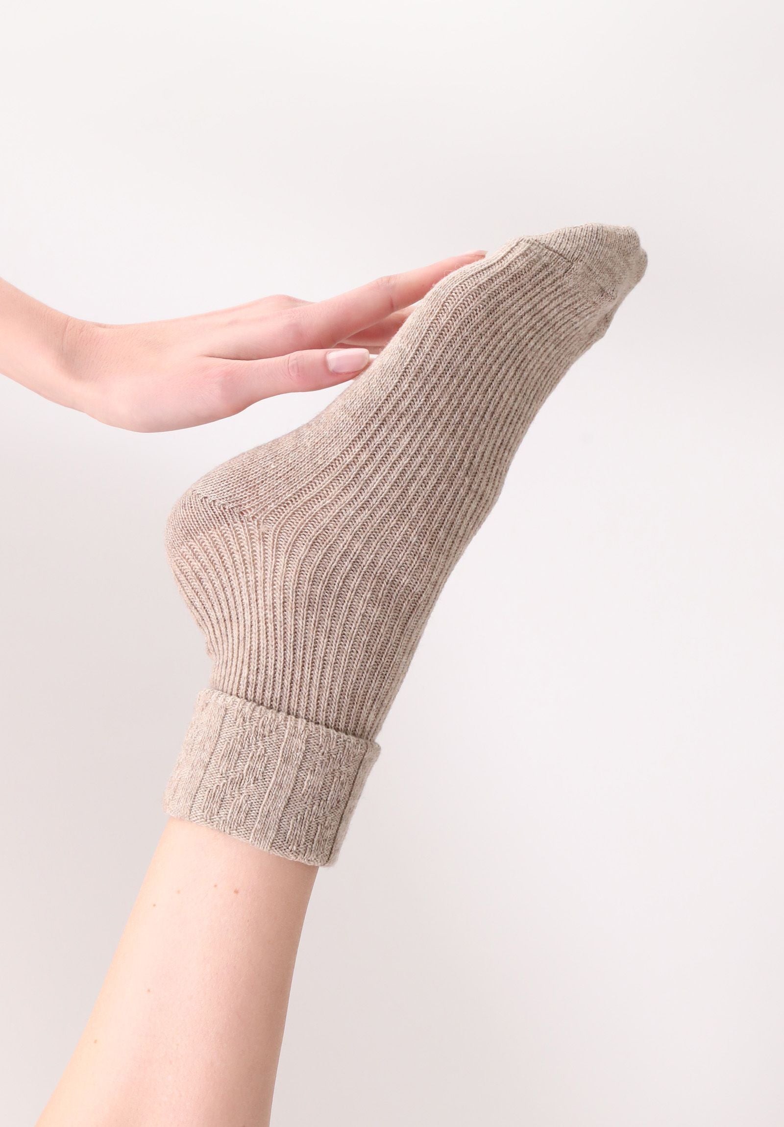 Aggiungi un tocco di eleganza e comfort al tuo guardaroba con questi calzini da donna in lana e cashmere con motivo a trecce e grazioso risvolto sottile. Questi calzini sono la scelta ideale per affrontare le giornate più fredde con stile e calore. Realizzati con cura utilizzando un mix pregiato di lana e cashmere, questi calzini offrono una sensazione di morbidezza avvolgente sulla pelle. Il loro tessuto di qualità superiore assicura una calzata comoda e una durata eccezionale nel tempo. Il motivo a trecce intrecciate conferisce un tocco di raffinatezza al design, rendendo questi calzini perfetti da indossare con qualsiasi outfit, dal casual al più formale. Il risvolto sottile aggiunge un tocco di grazia, aggiungendo un dettaglio grazioso e femminile.