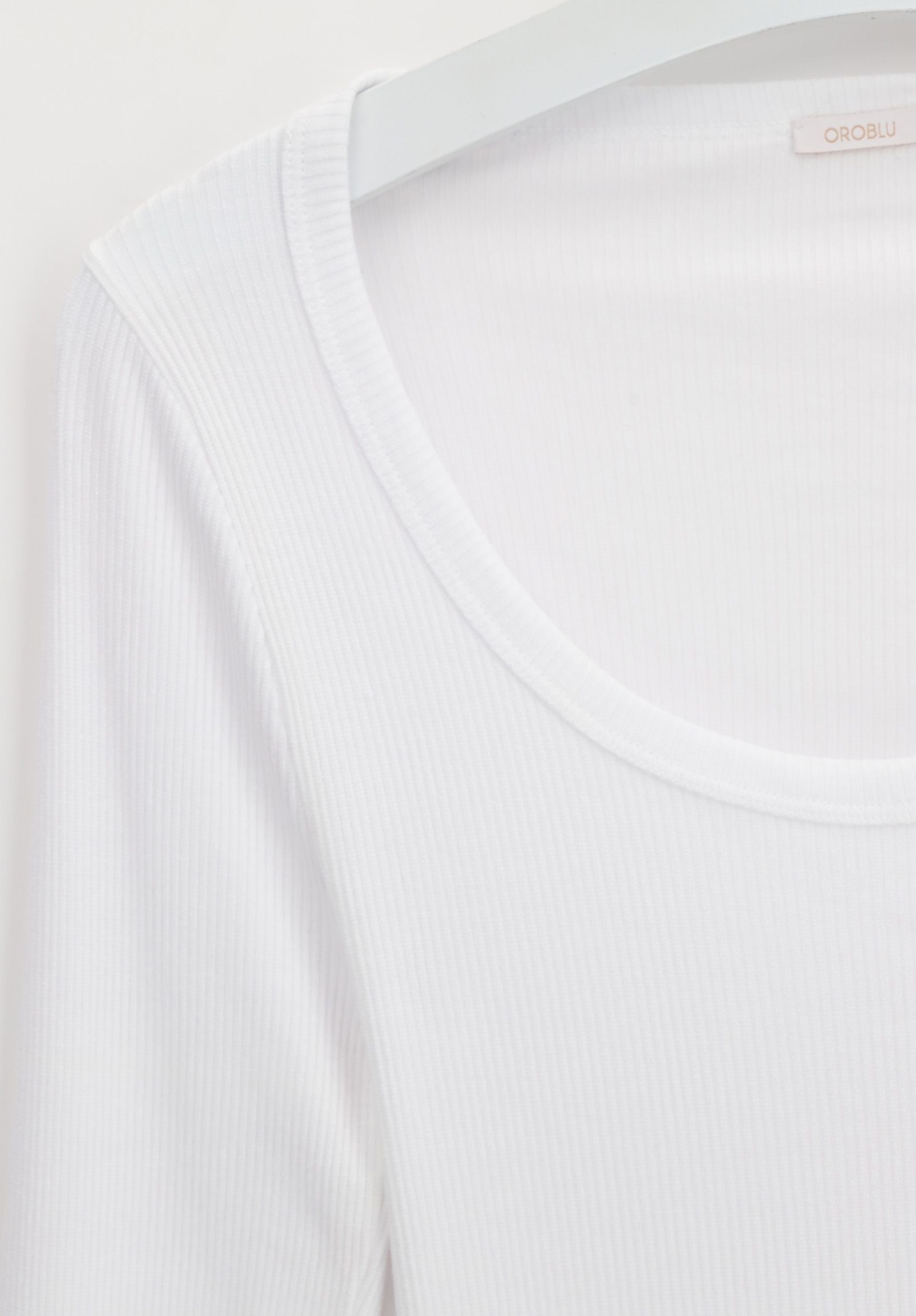 Questo top a manica lunga presenta un profondo scollo tondo ed è realizzato in morbido modal, leggero e pregiato, miscelato con elastan. Lavorato in tubolare e a costine sottili, questo capo offre una vestibilità senza cuciture sui fianchi, garantendo comfort e stile in ogni occasione.
